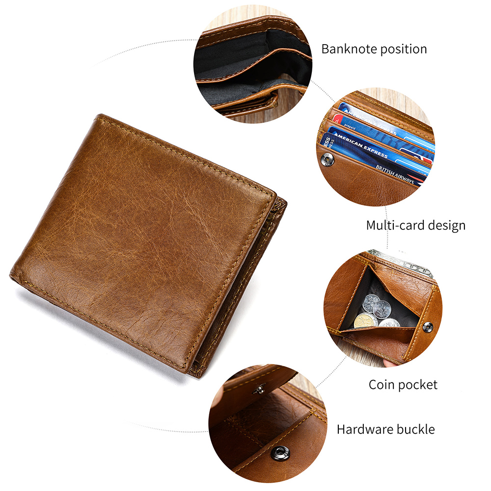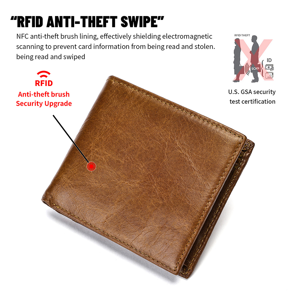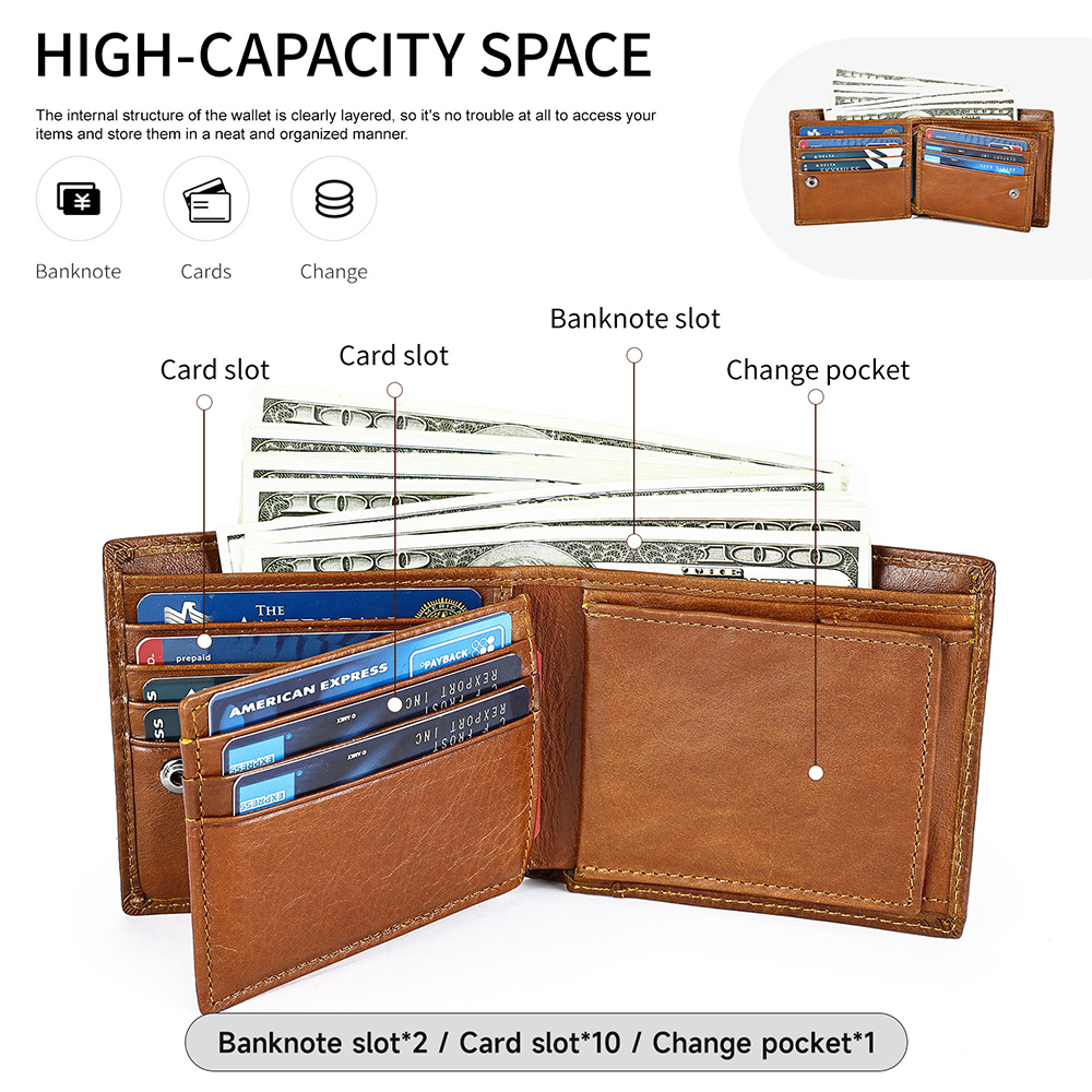 - The Gowalletly men’s wallet is made from premium cowhide leather with a soft, refined texture. It features RFID-blocking technology to protect your personal data. With 10 card slots, 2 bill compartments, and 1 large coinpocket, it’s perfect for everyday use or a stylish, practical gift.